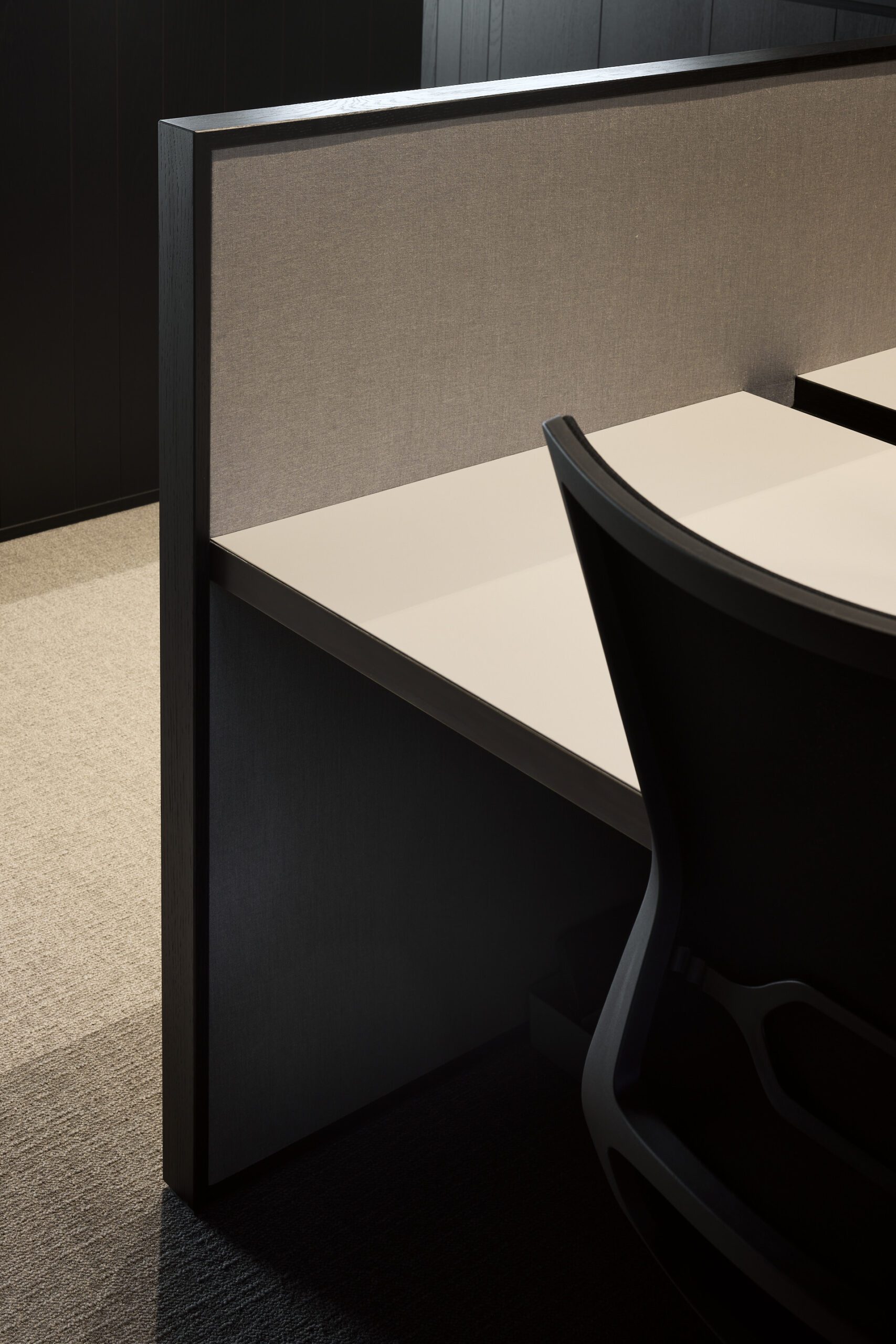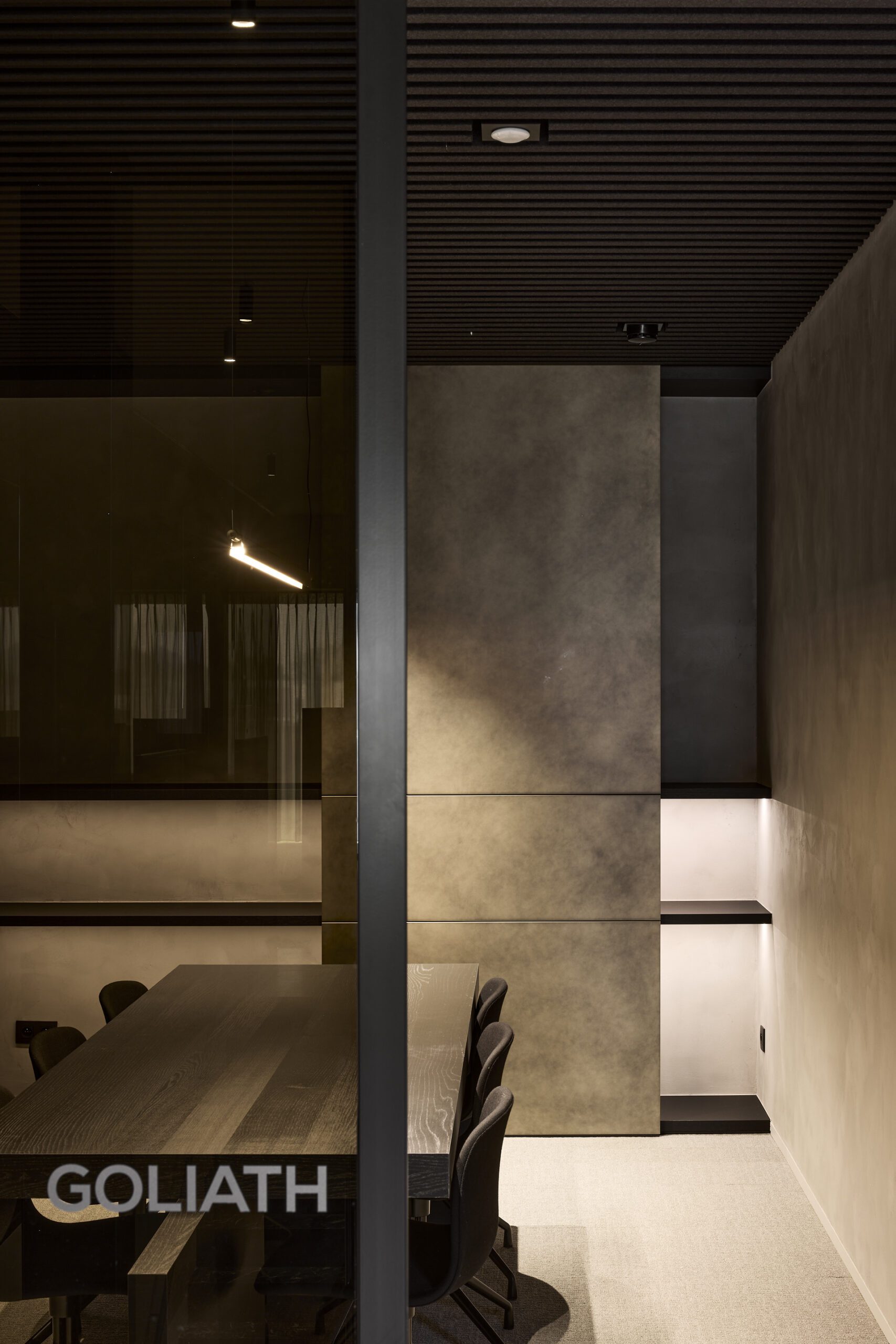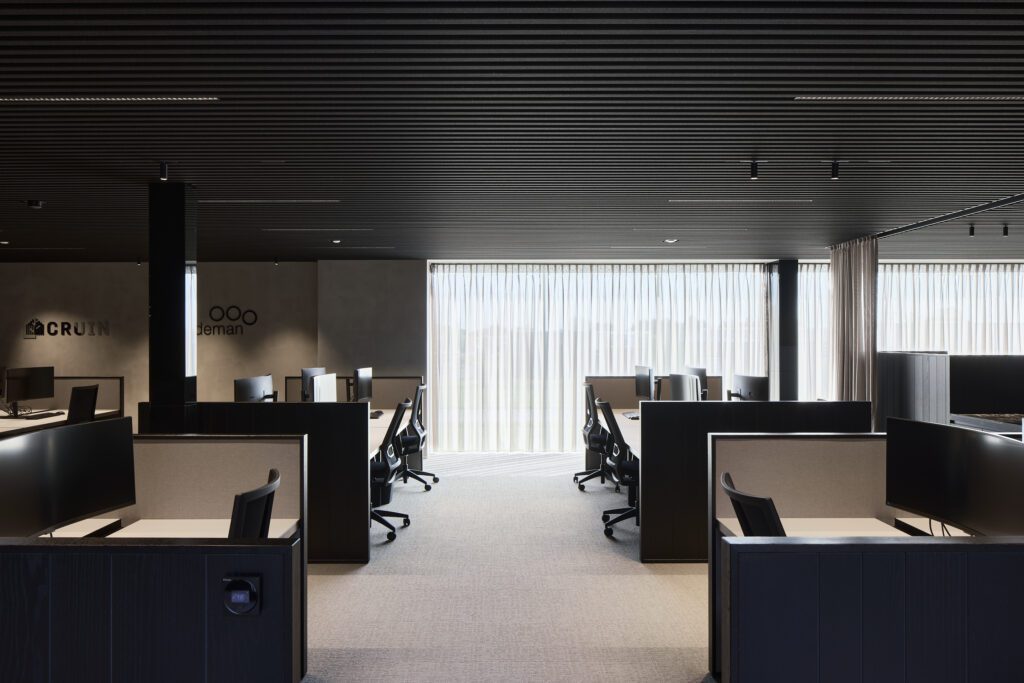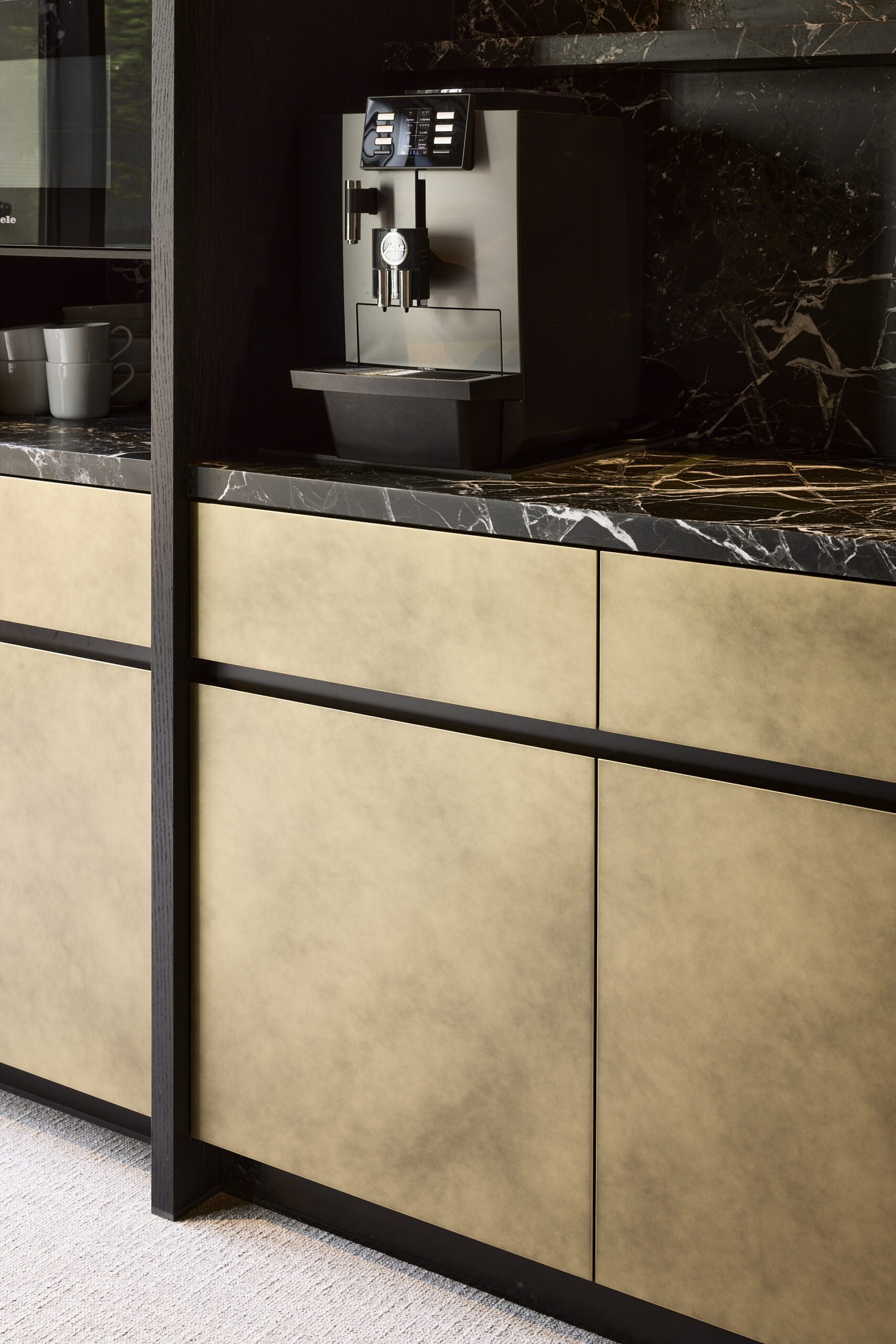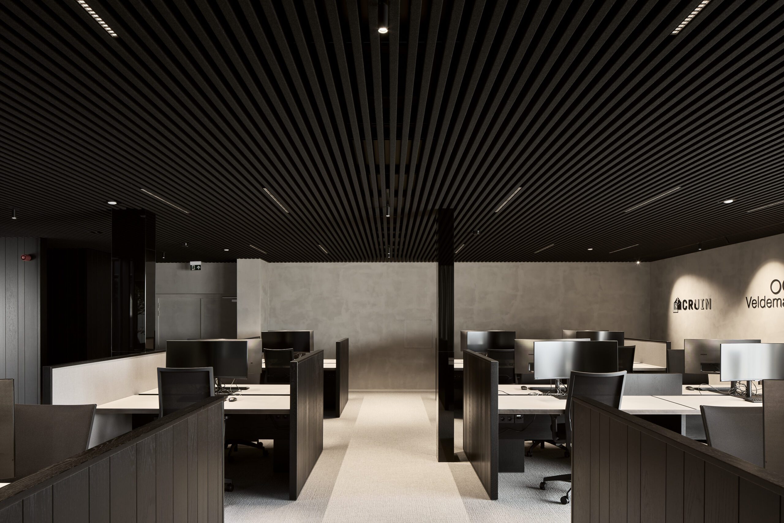 High end kantoorinrichting Cruin & Veldeman met gebruik van eik fineer, Petac, natuursteen, bronslak en cementpleister.