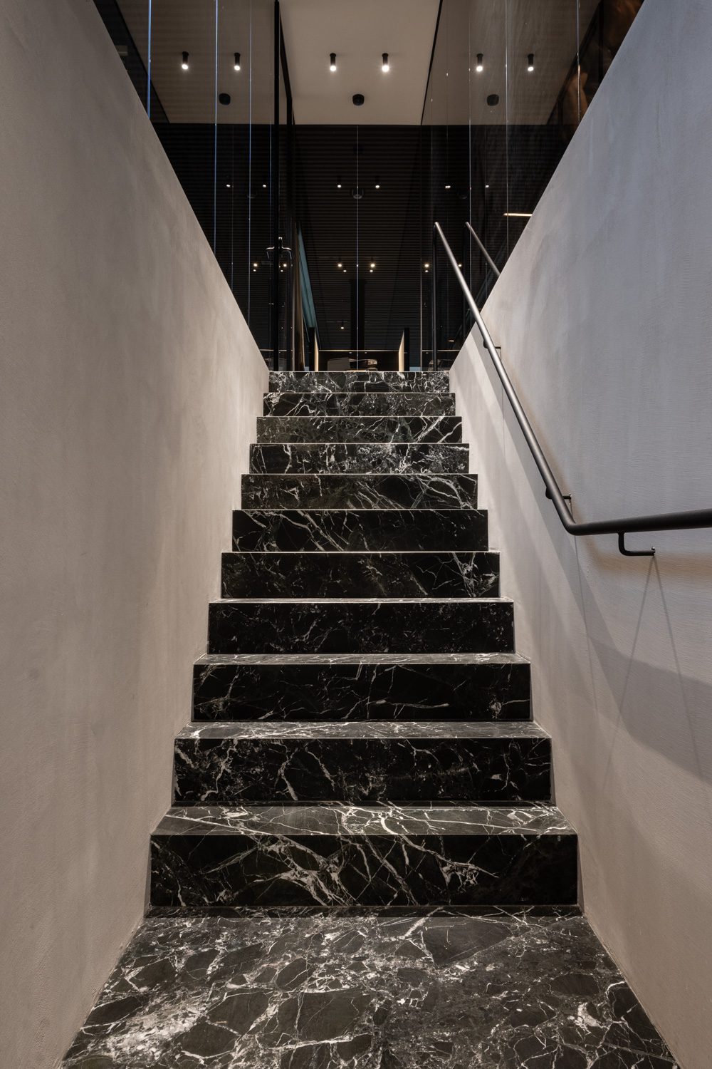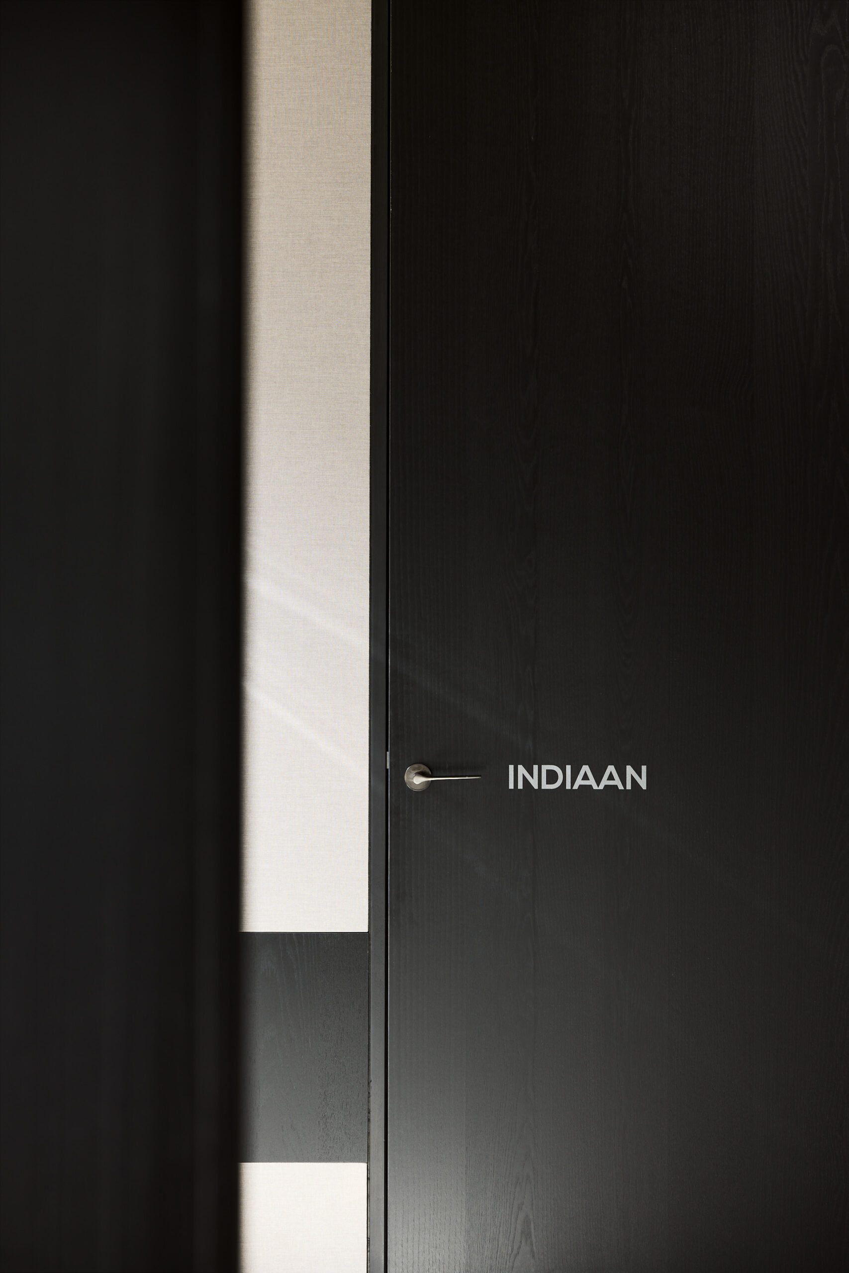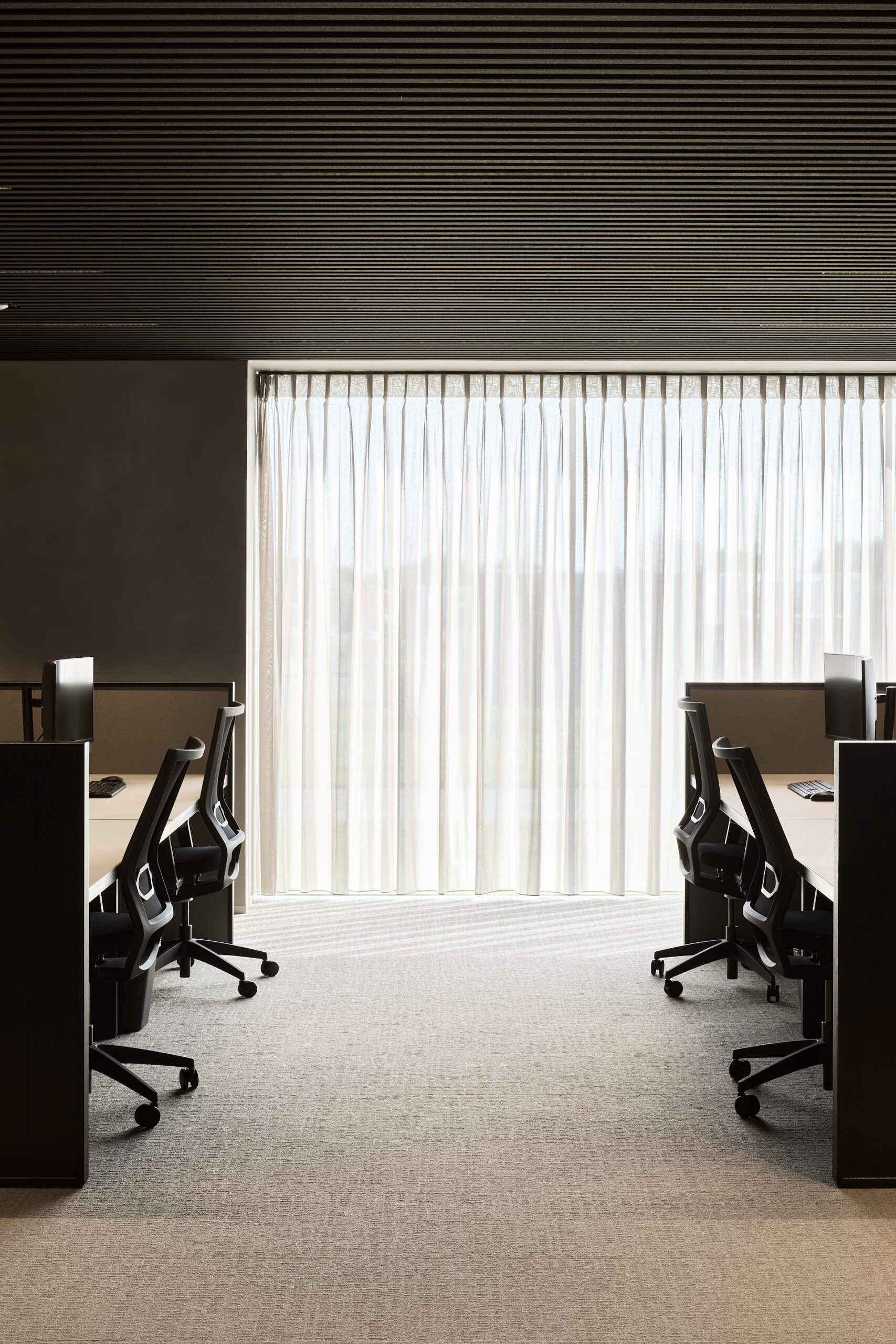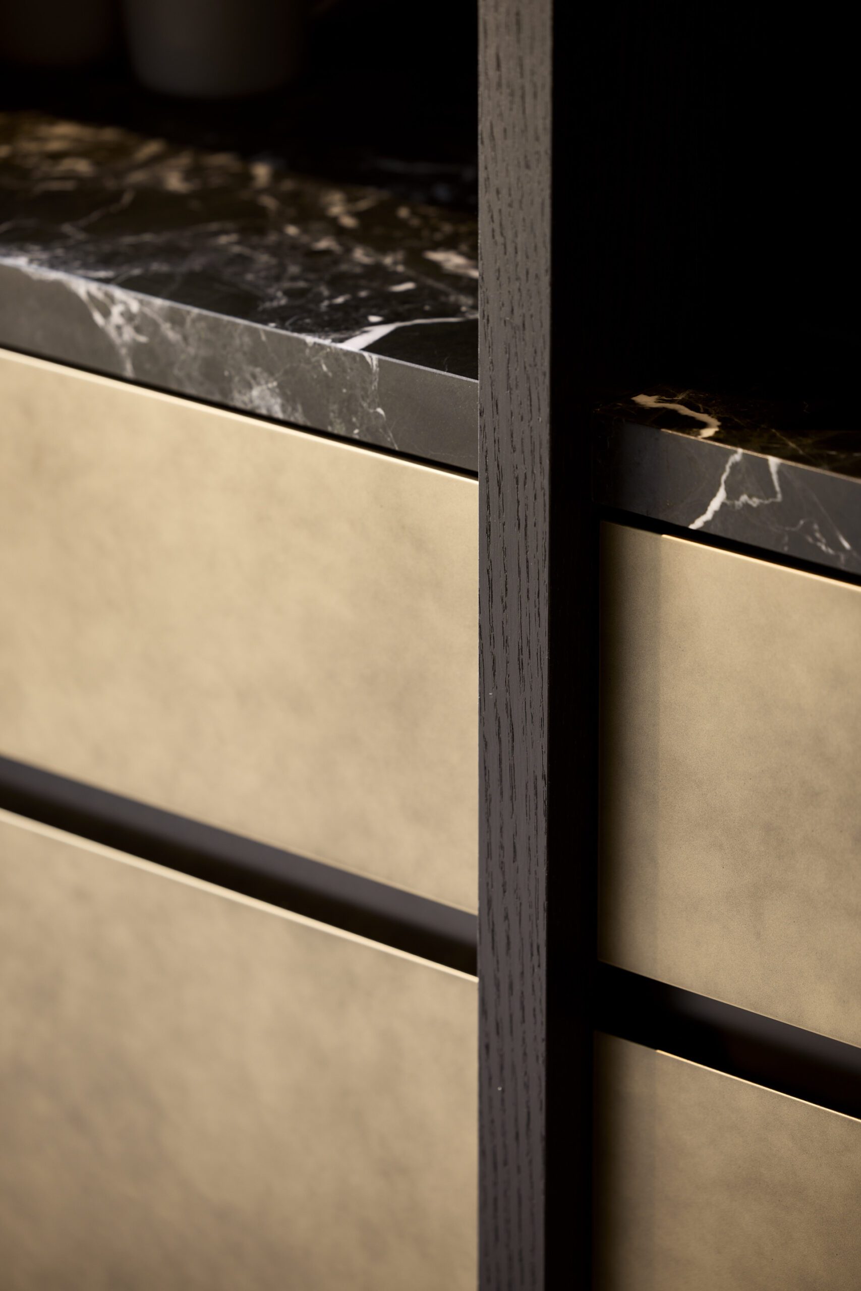 High end kantoorinrichting Cruin & Veldeman met gebruik van eik fineer, Petac, natuursteen, bronslak en cementpleister.