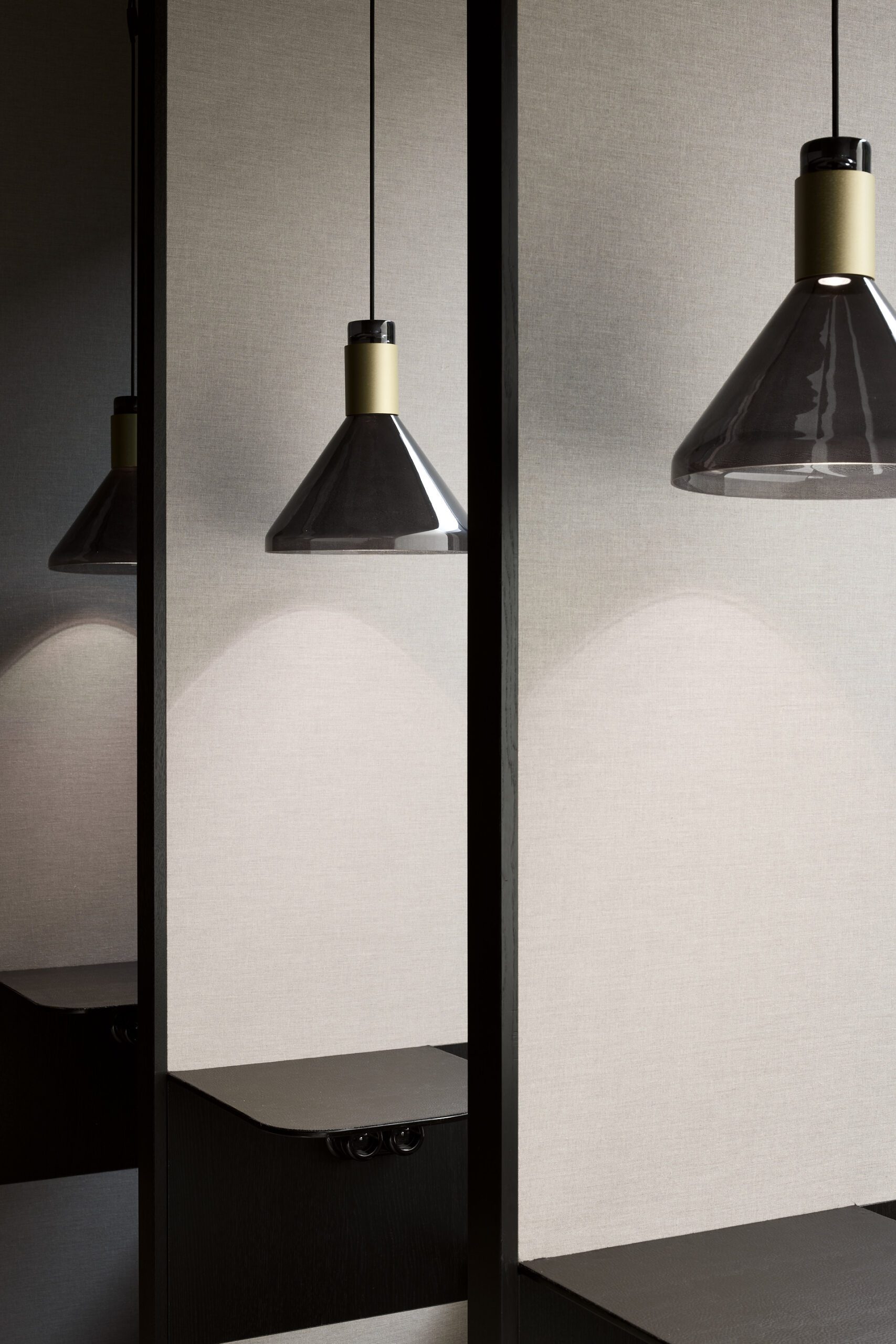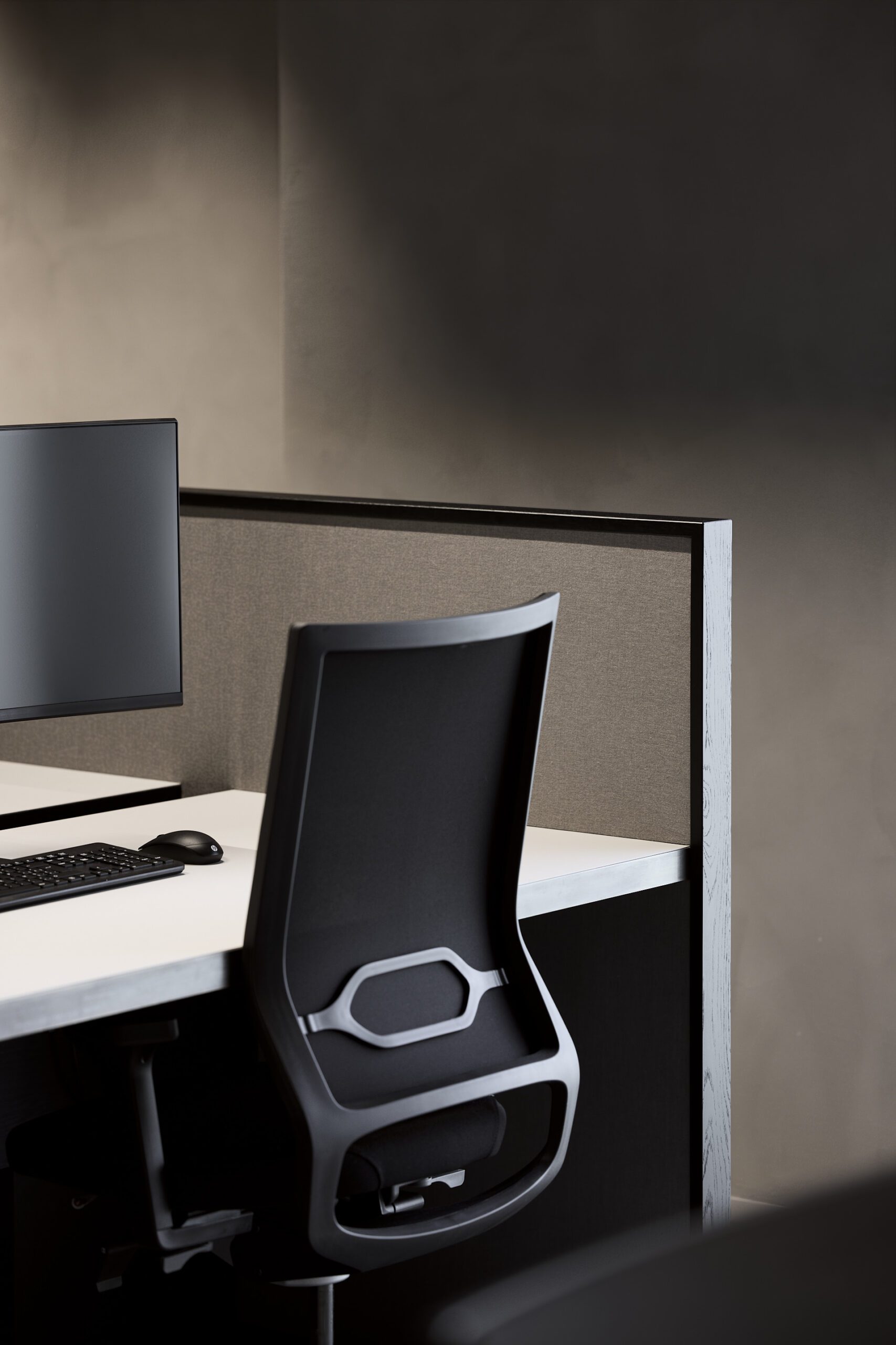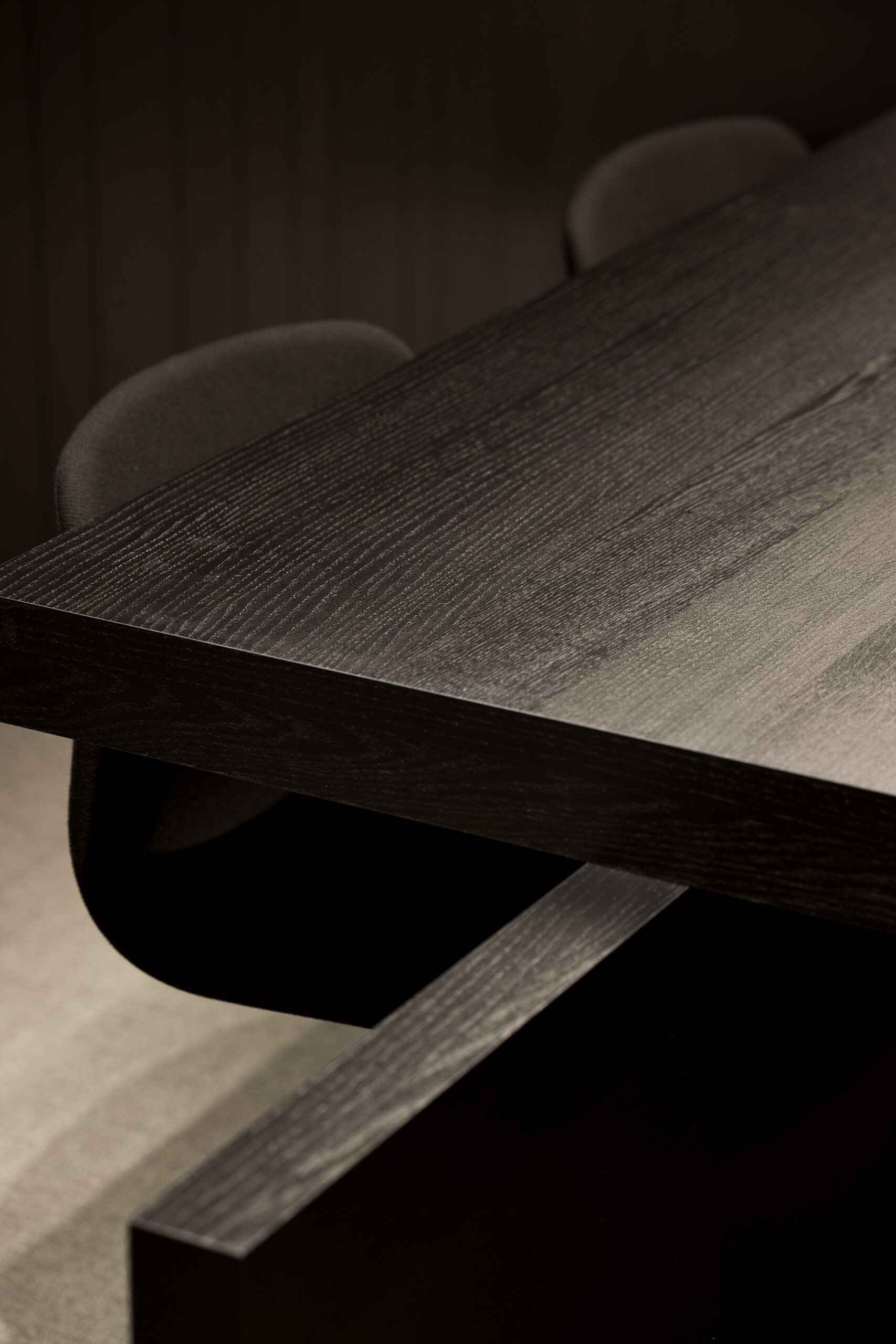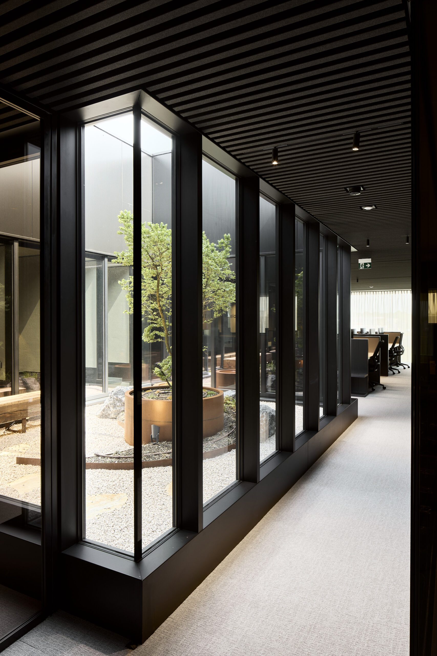 High end kantoorinrichting Cruin & Veldeman met gebruik van eik fineer, Petac, natuursteen, bronslak en cementpleister.